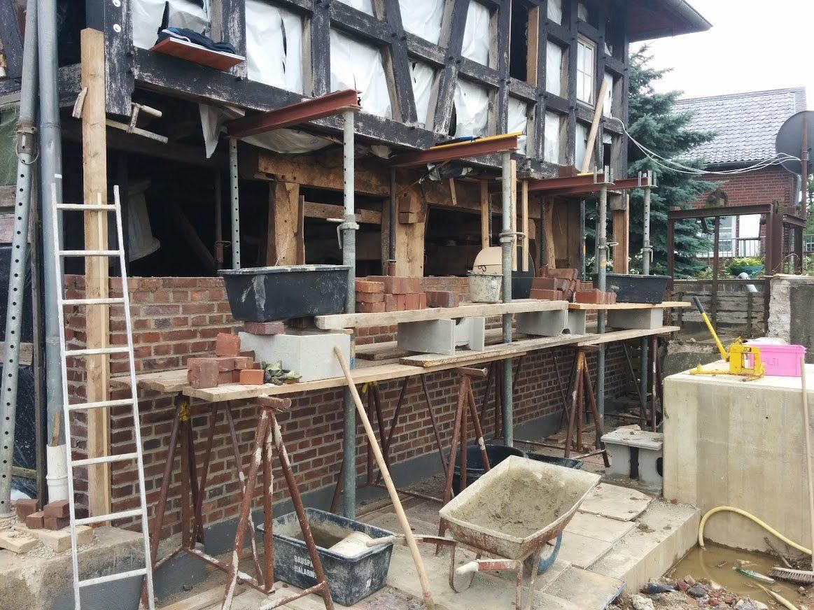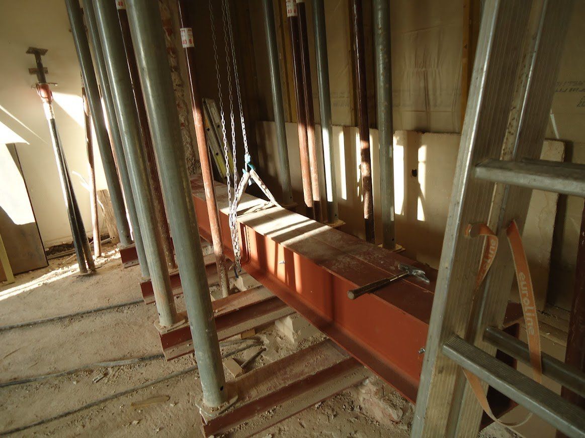 Stahlträgerkonstruktionen einbauen ist eine Herausforderung. Auch die Statisch erforderliche Notabstützung mag gut überlegt sein.