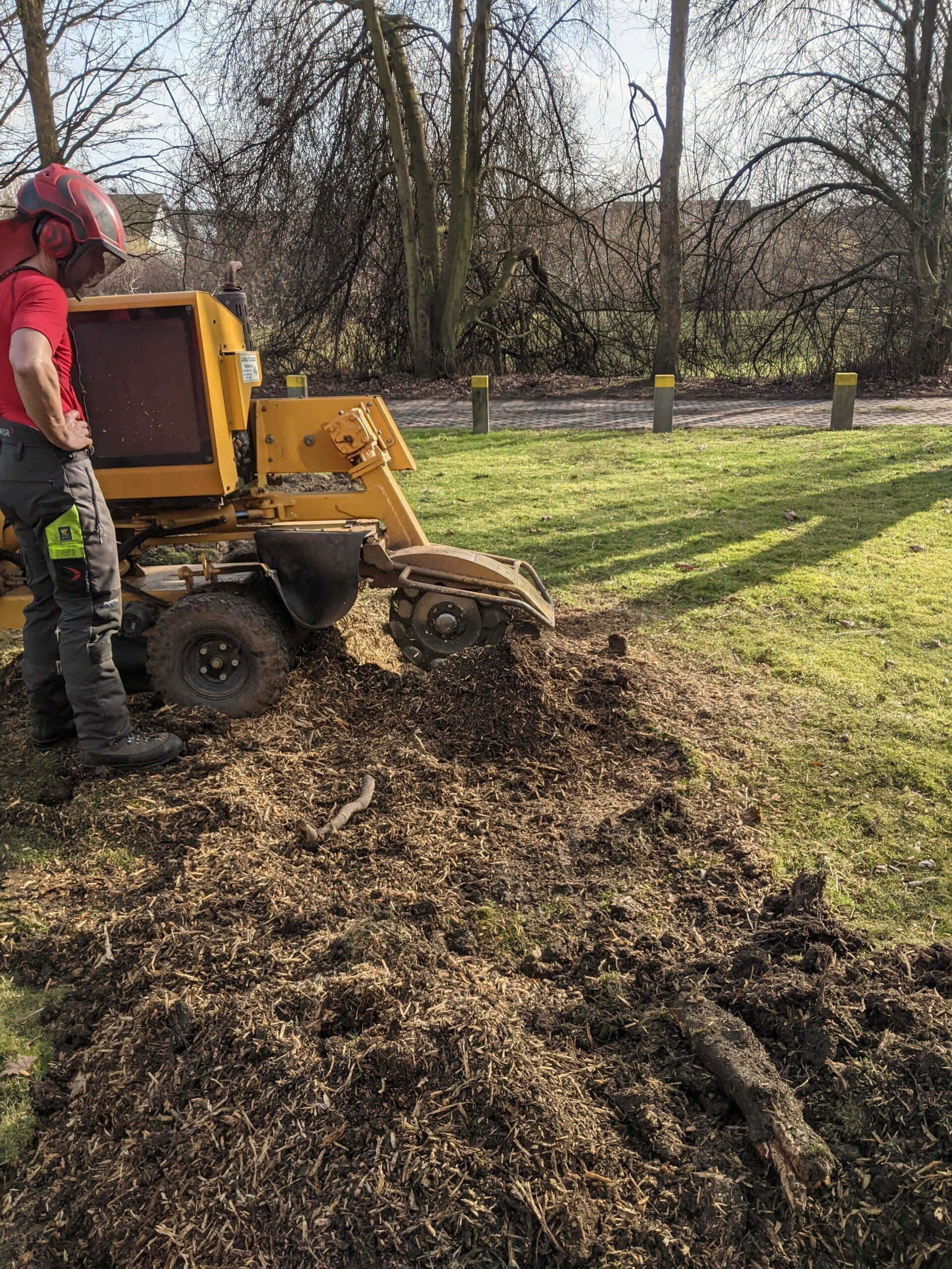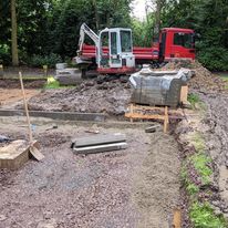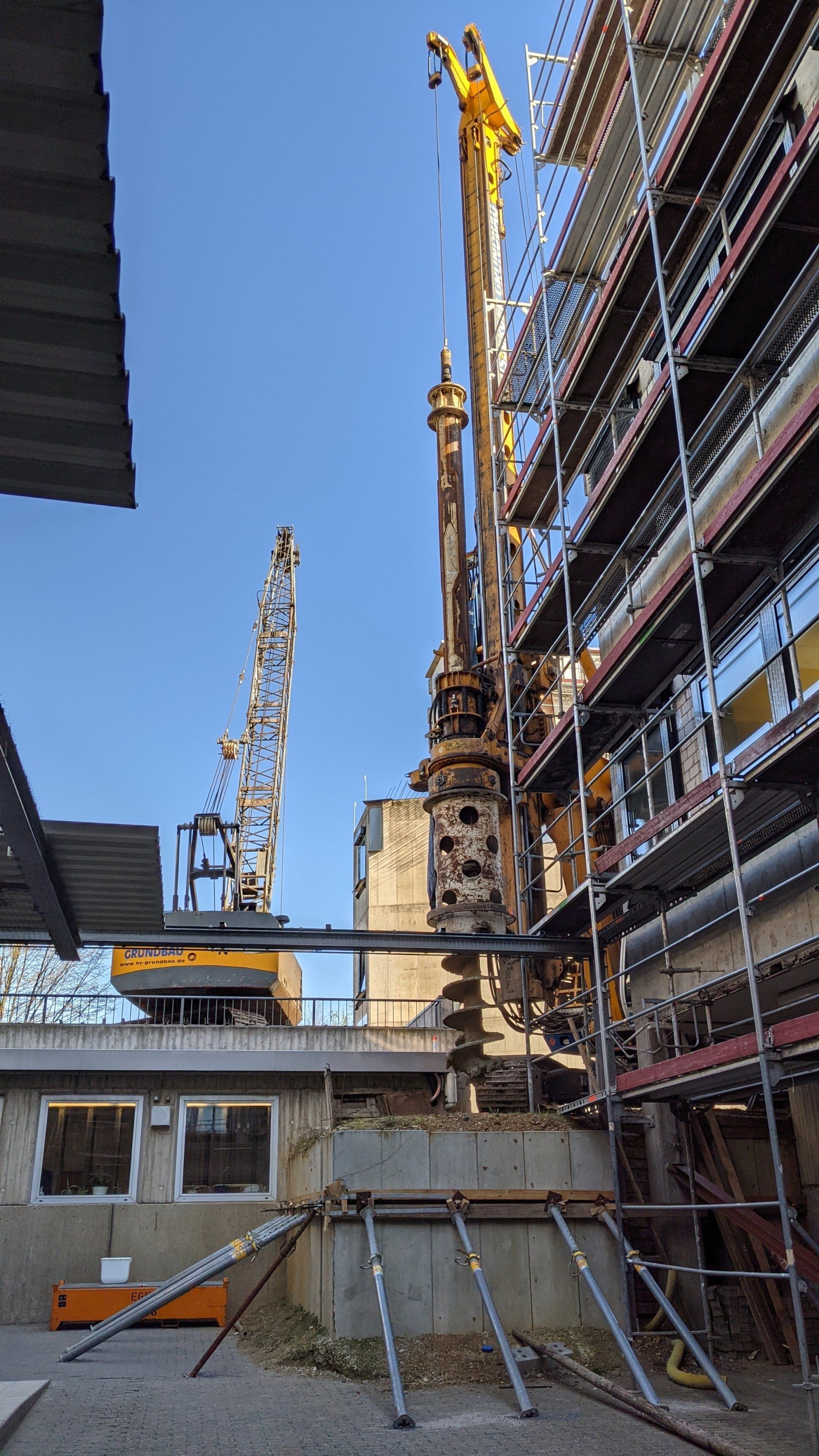 Stellfläche mit L-Steinen und Abspannungen für ein schweres Bohrgerät zur Pfahlgründung errichtet. Spätere Demontage erfolgt.