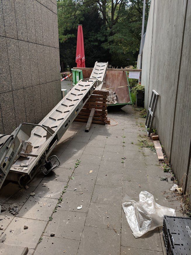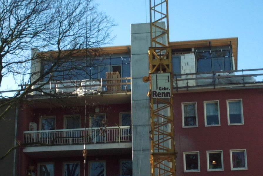 Das Material muss auf das Dach und die Strasse muss immer frei gehalten wedren da hier Rettungswagen das Krankenhaus anfahren.