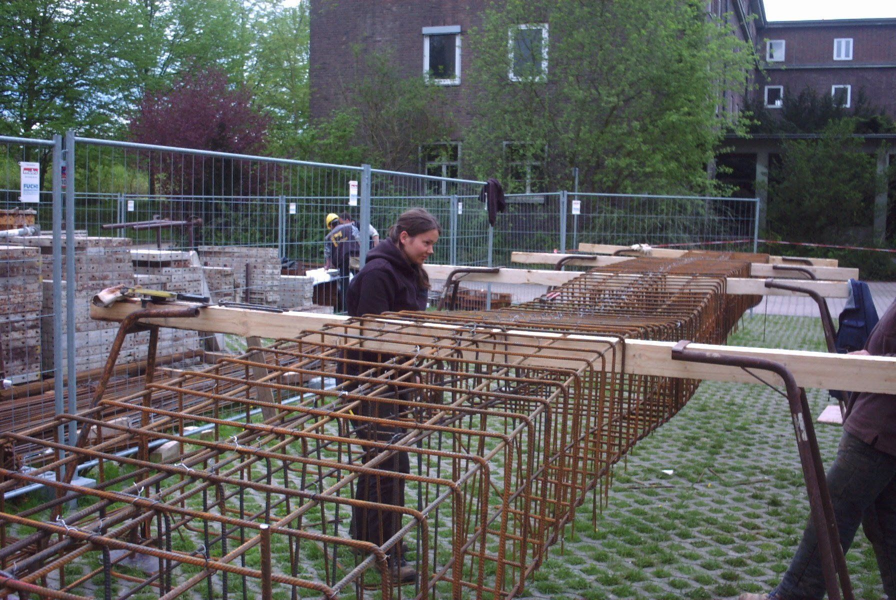 Die Praktikantin bei der Erstellung eines Bewehrungskorbes